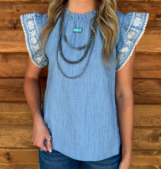 Blue Floral Embroidered Top