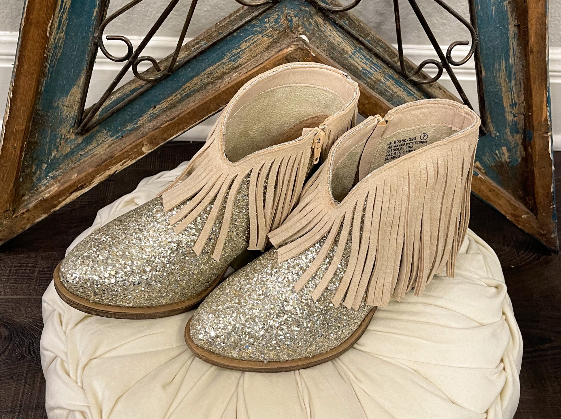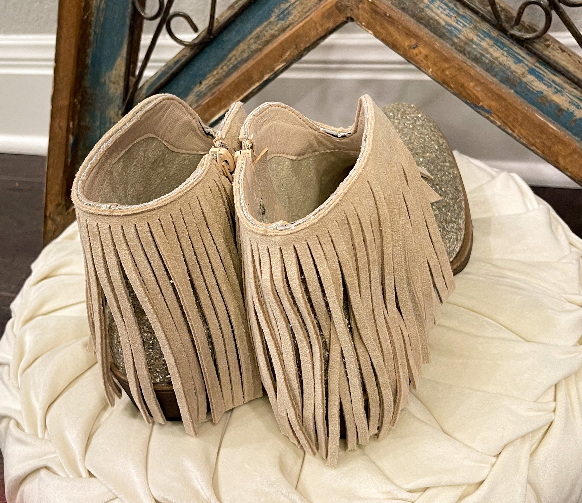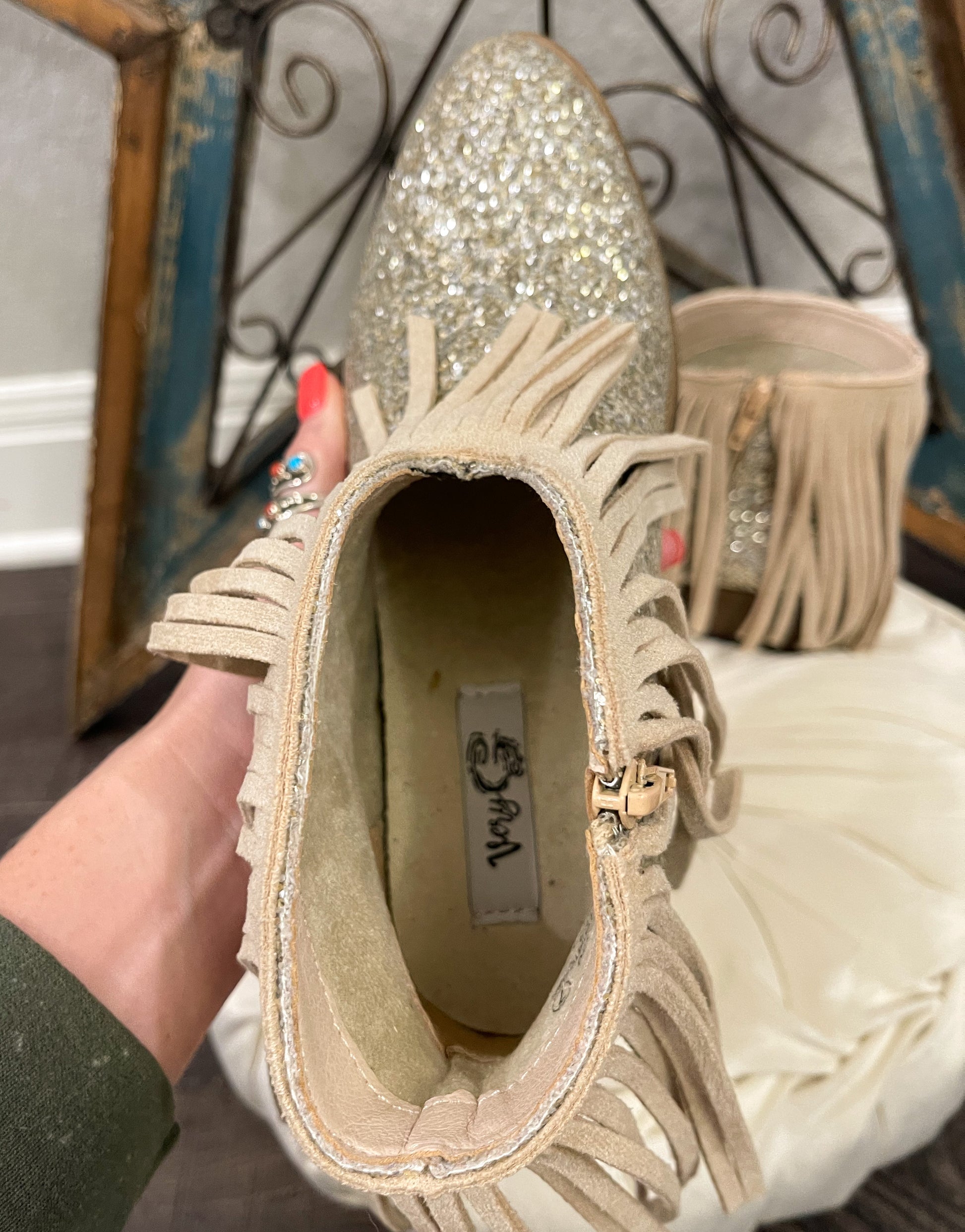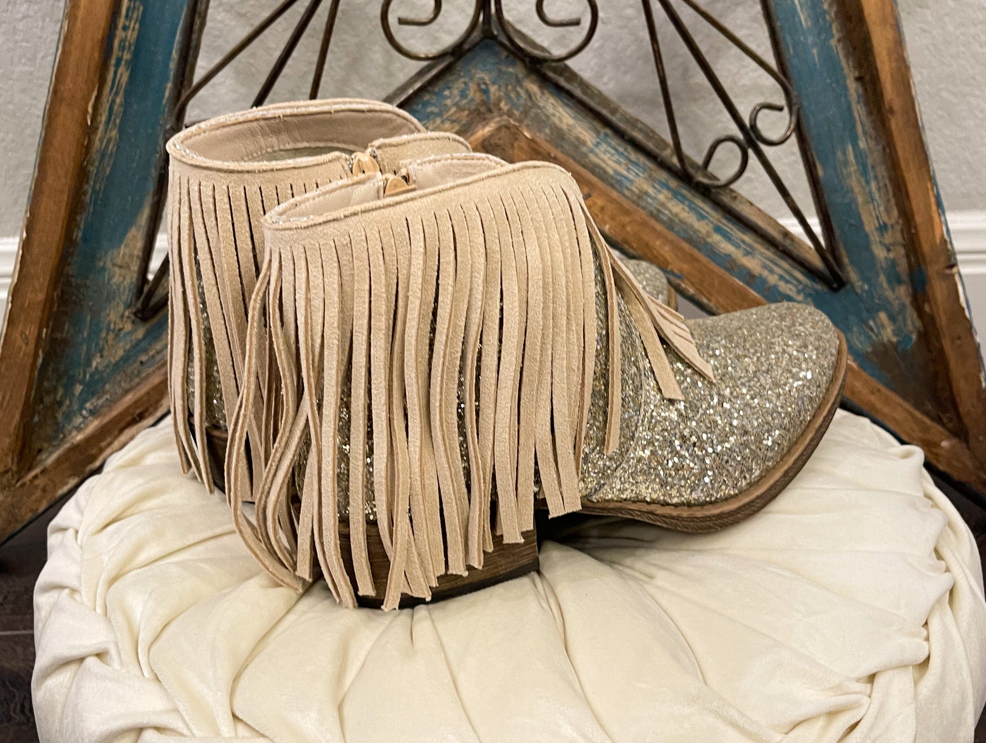 The absolutely gorgeous Jean Bootie by Gypsy Jazz features fun and stunning fringe and gorgeous cream glitter.