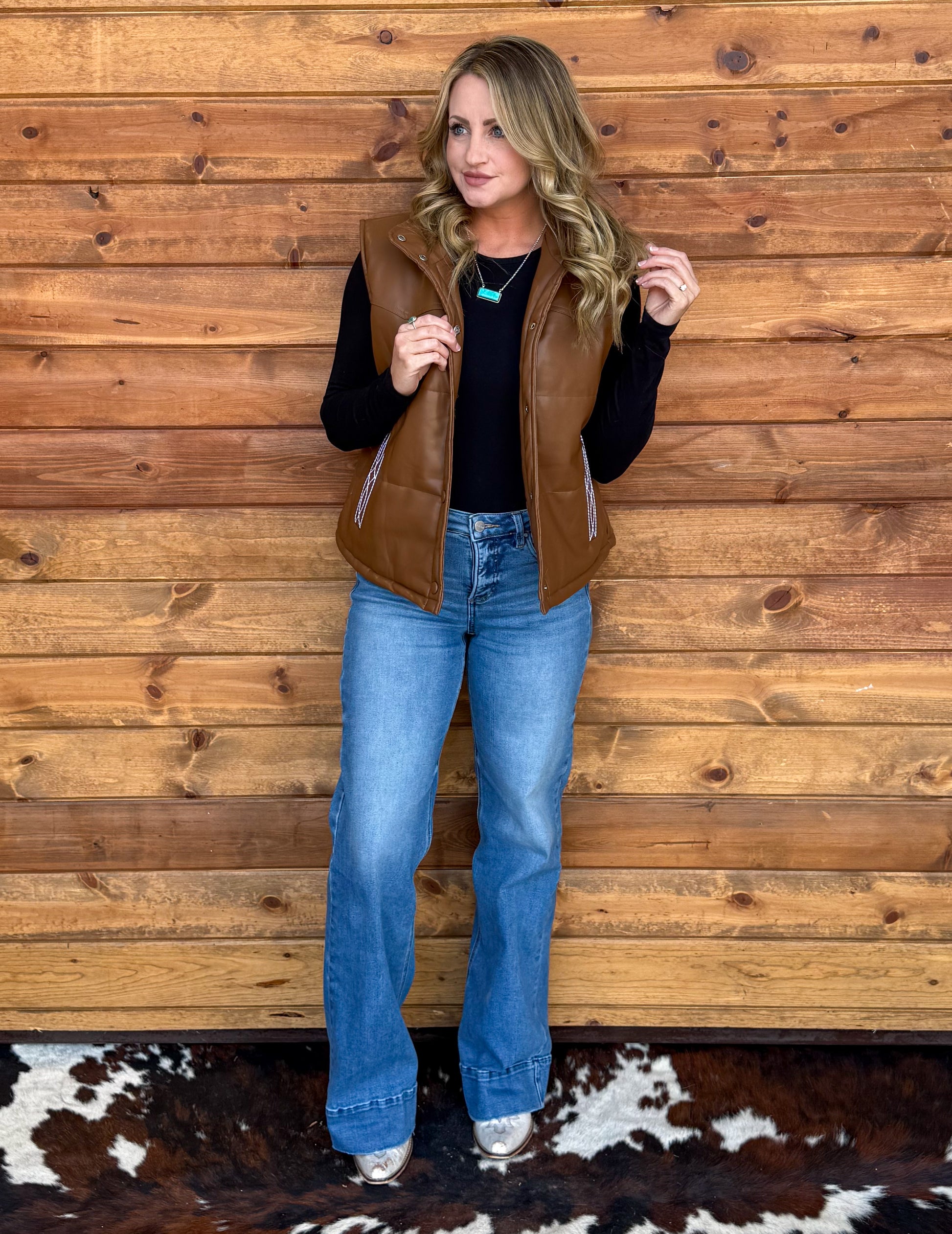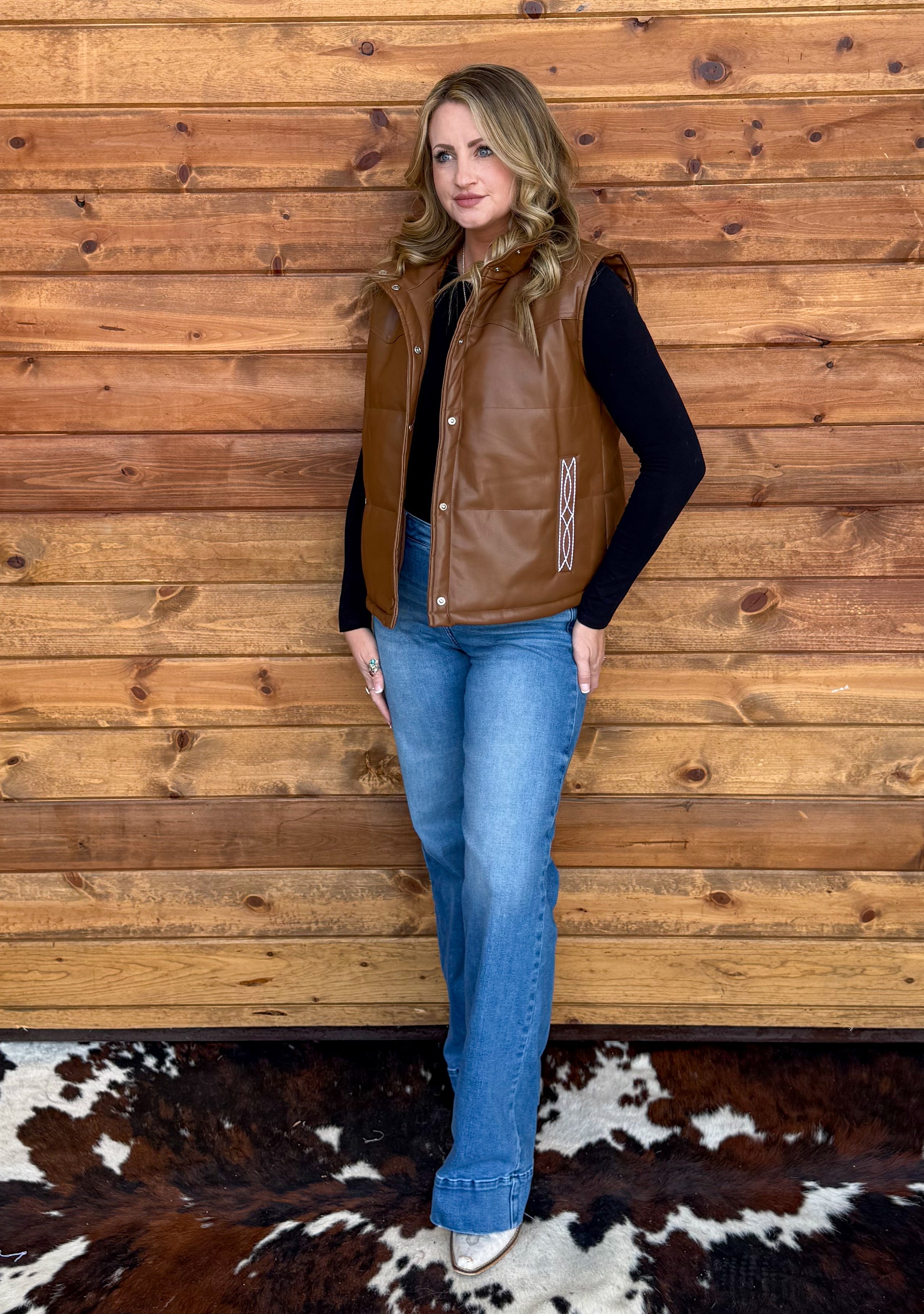 A faux leather brown puffer vest