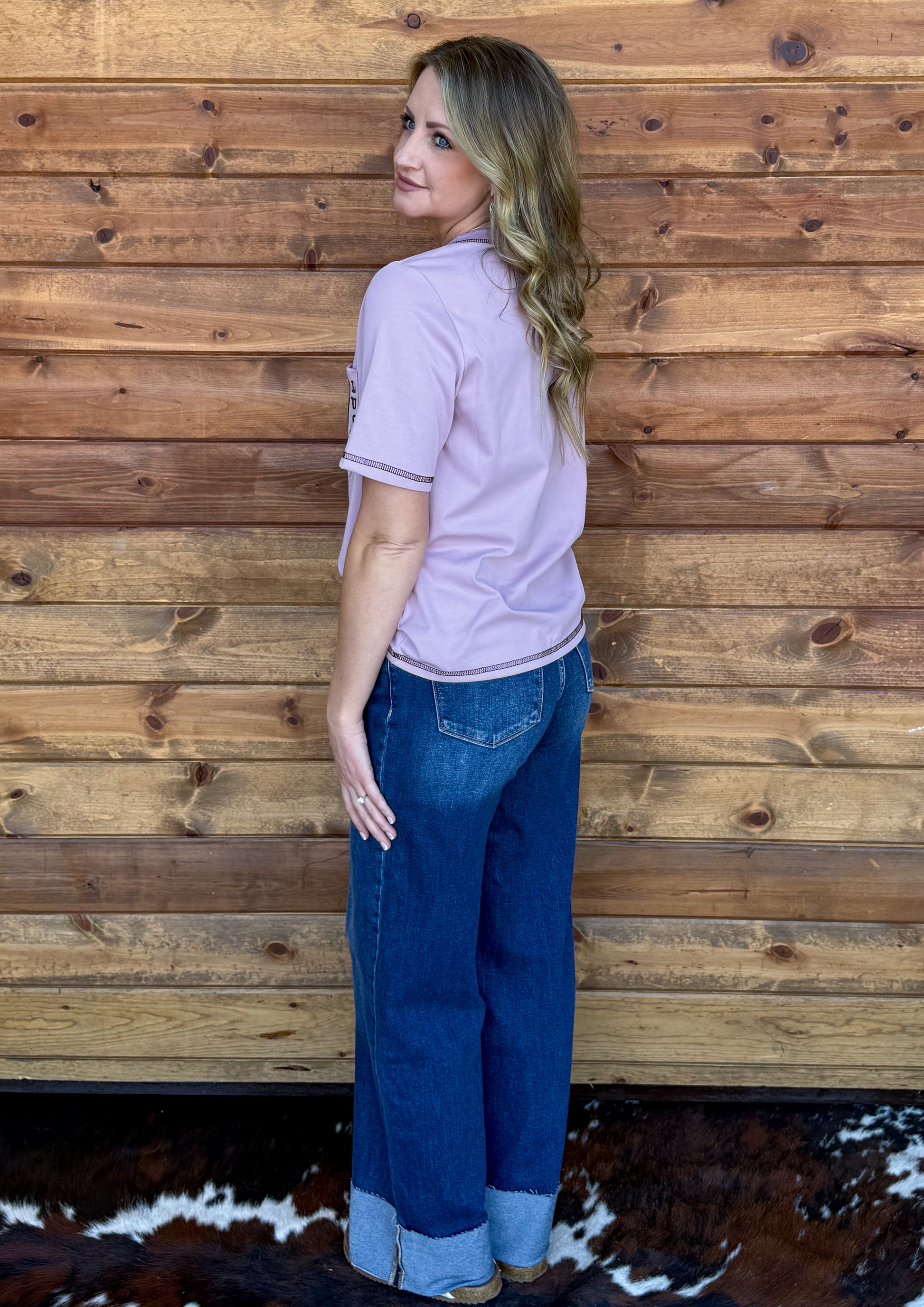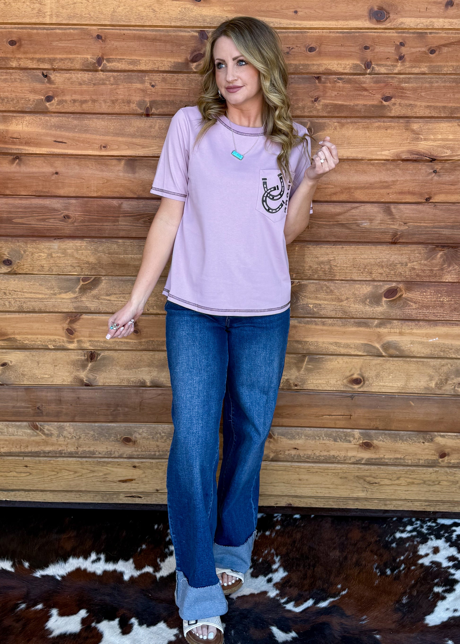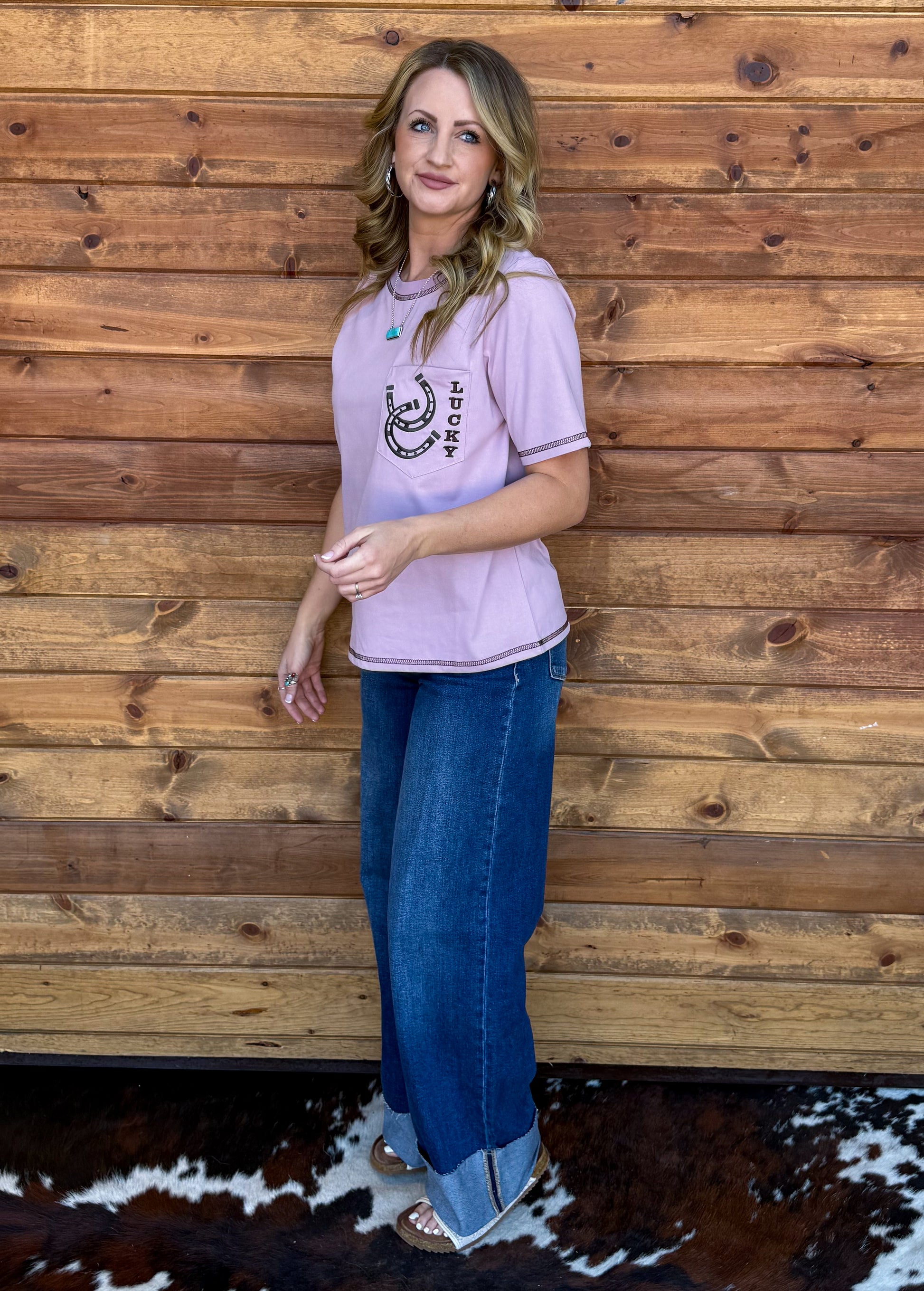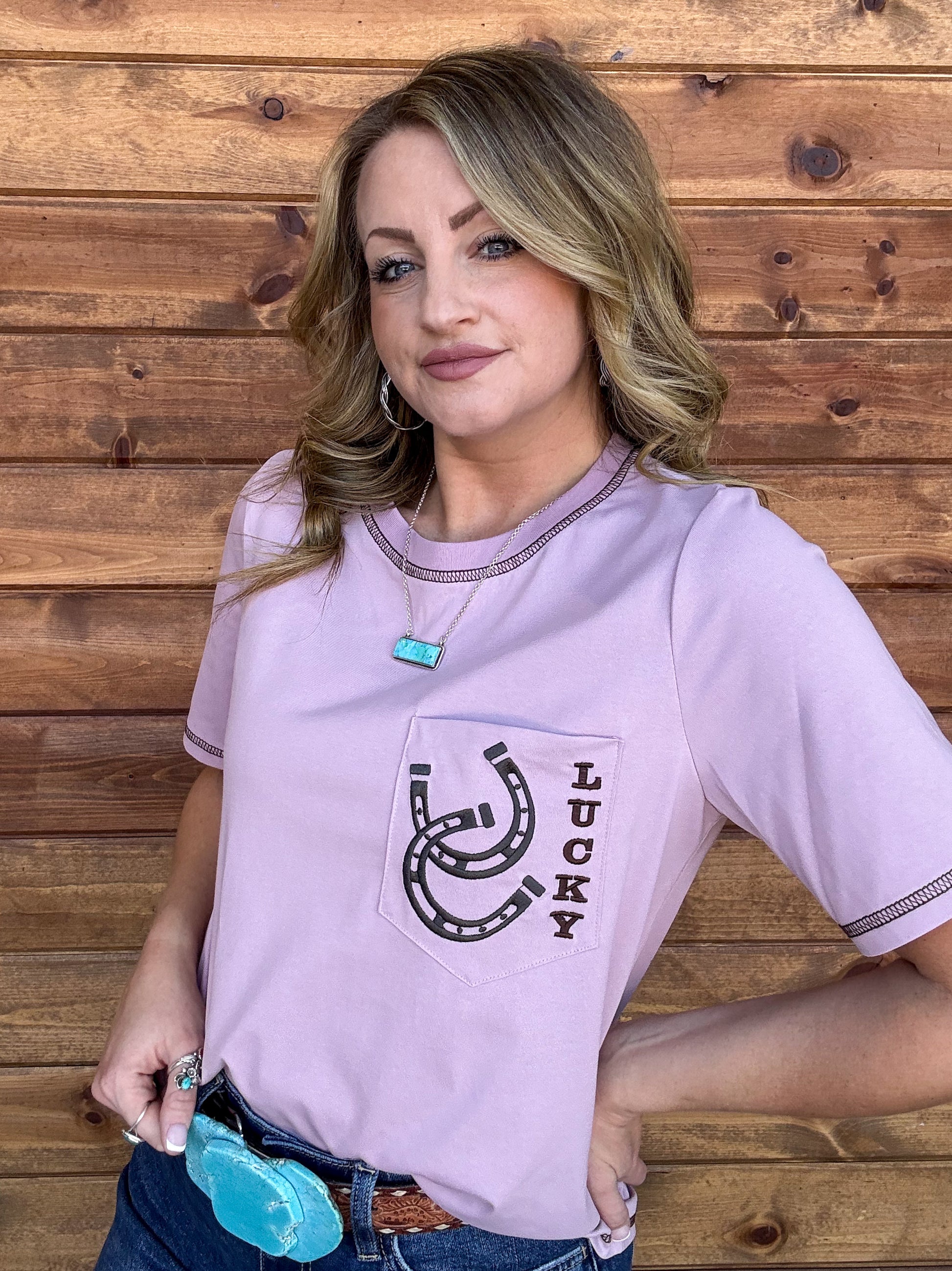 Black embroidered Lucky Horseshoe design on front chest pocket